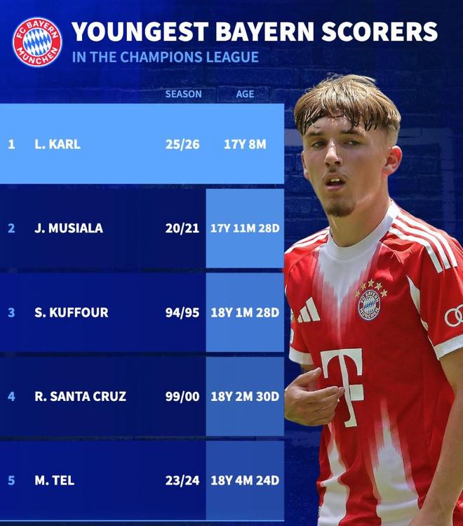 拜仁欧冠最年轻进球者前5:卡尔第1,穆西亚拉第2,特尔上榜